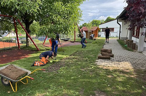 um die Sicherheit der Kinder zu gewähren, bauten wir im Garten des Kindergartens St. Marien Fallschutzmatten unter.....