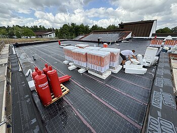 Das Dach ist komplett isoliert und bereits eine Schweißbahn aufgebracht.