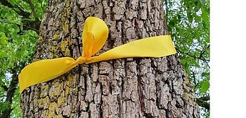 Deshalb bekommen die Bäume der Gemeinde ein gelbes Band als Zeichen, dass das Obst gerne geerntet werden darf.