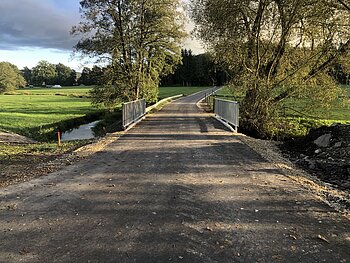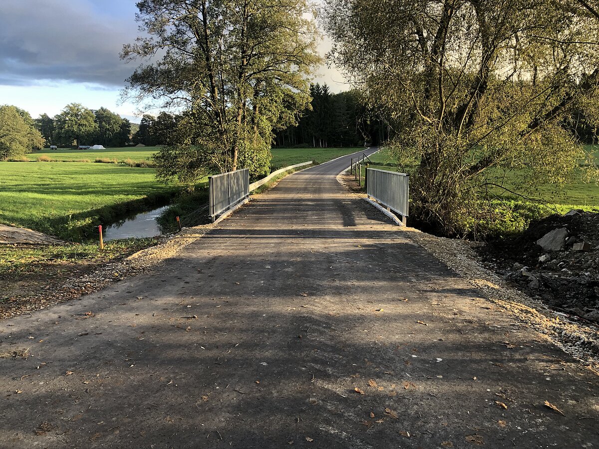 mit landwirtschaftlichen Fahrzeugen schwierig zu befahren. Im Zug der Verlegung der Rieswasserleitung konnten wir die Brücke komplett sanieren. Ein Fundament wurde erneuert und die Brücke komplett überbetoniert. Nach dem Asphalteinbau konnten wir ein neues Geländer anbringen. Die Durchfahrtsbreite entspricht nun den landwirtschaftlichen Anforderungen. Alle Arbeiten, auch die Anfertigungen des Geländers wurde von unseren Bauhofmitarbeitern erledigt. Dadurch konnten wir erhebliche Einsparungen machen.