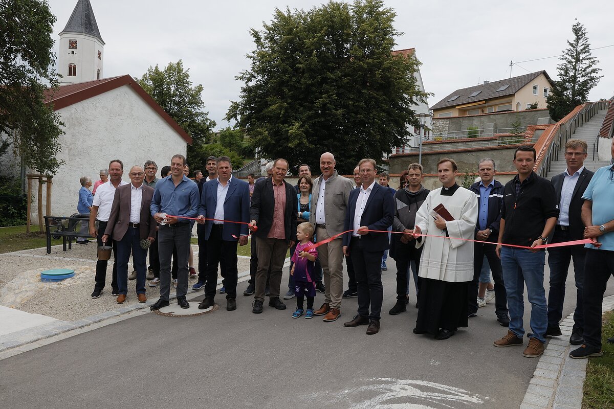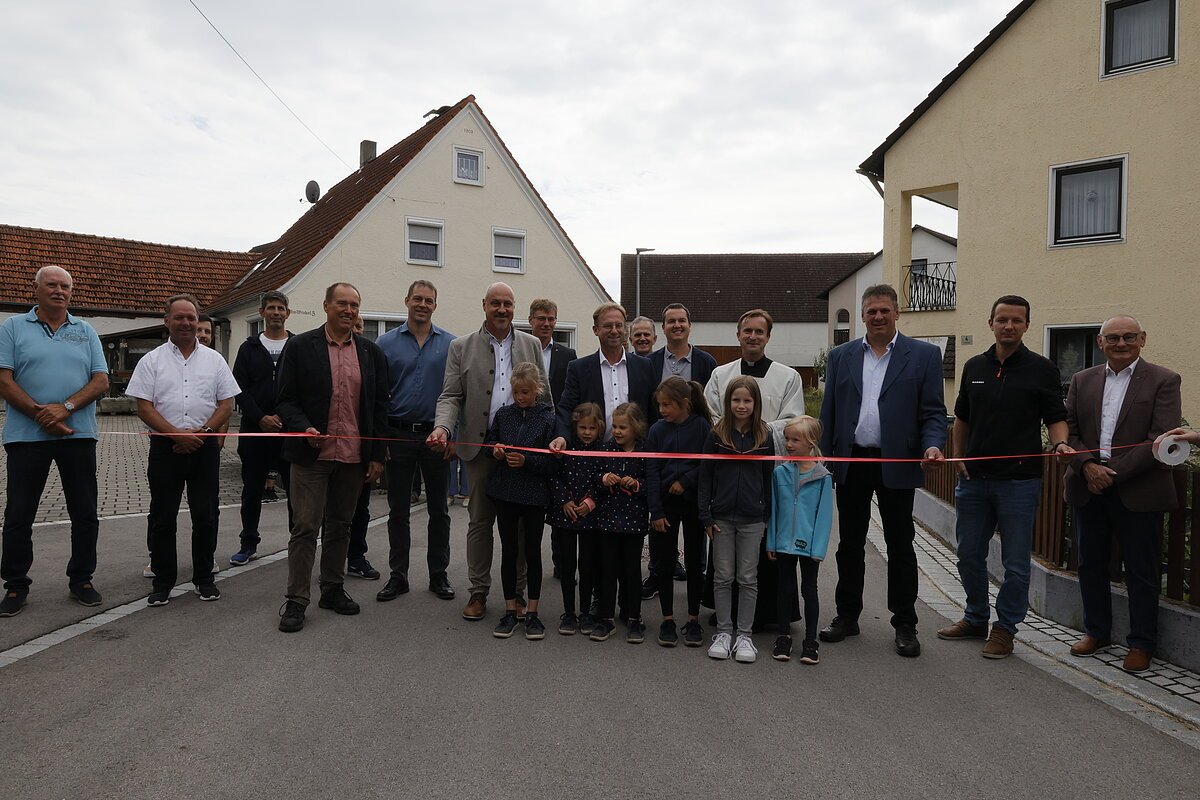 In nackten Zahlen bedeutet das für die rund 650m lange Strecke Kosten für den Straßenbau von ca. 1 Million Euro bei einer Förderung von ca. 63% und für 715m Kanal und Wasser ca. 770.000 Euro bei einer Förderung von ca. 65%. Zunächst waren diese vier Straßen nicht im geplanten Dorferneuerungsplan enthalten. Kurz vor Weihnachten 2019 erhielt dann Bürgermeister Müller die freudige Nachricht, dass für die Straßen nun doch Fördergelder zur Verfügung stehen und mit der Planung der Sanierung begonnen werden könnte. „Es war damals wirklich ein Weihnachtsgeschenk“ betonte Müller, da die Straßen, die mindestens 60 Jahre alt waren, sich in einem sehr maroden Bauzustand befanden. Die Durchführung der Sanierungsmaßnahmen stellte dann nicht nur das Planungsbüro sondern auch die beteiligten Firmen vor eine Mammutaufgabe. Enge Kurven, steile Streckenabschnitte, viel Grundwasser und diverse Überraschungen bei den Kanalbauarbeiten sowie die schwierige Zufahrtssituation für das Abtransportieren von Abräummaterial und das Einbringen von neuem Material erforderten von allen Beteiligten eine hohe Fachkompetenz. Da alle vier Straßen quasi eine Baustelle darstellten kam es immer wieder zu zeitlichen Verzögerungen und es konnten nicht alle Straßen rechtzeitig vor dem Wintereinbruch asphaltiert werden. Müller hob besonders die Baumaßnahme der langen Treppe in der Straße „Am Bergle“ hervor, die ihm besonders am Herzen lag. Exakte Planungen und Vorbereitungen gingen voraus um sicherzustellen, dass Tiefe und Höhe der einzelnen Treppenstufen ein sicheres und ermüdungsfreies Laufen ermöglichen. Hier legte der Bürgermeister zusammen mit Hans-Ludwig Held, Inhaber der Firma Stein Held aus Wemding, selbst Hand an. Die Treppe „ist nicht gut, die ist perfek!“ betonte Müller. Die Mühen haben sich wirklich gewohnt. Die Anwohner haben jetzt moderne Straßen mit Gehwegen und Grünstreifen, ein modernes Kanalsystem, Glasfaseranschluß und im Boden verlegte Stromleitungen. So ausgerüstet sollten die Straßen über viele Jahre ihren Zweck erfüllen und den Anwohnern eine hohe Wohnqualität sichern. So hat die Gemeinde die Grundvoraussetzung für eine gute Lebensqualität geschaffen und mit den Worten von Pfarrer Lazar „Es sind die Meschen auf die es drauf ankommt, die diese Wege beschreiben“ liegt es nun an jedem Einzelnen das Beste daraus zu machen.